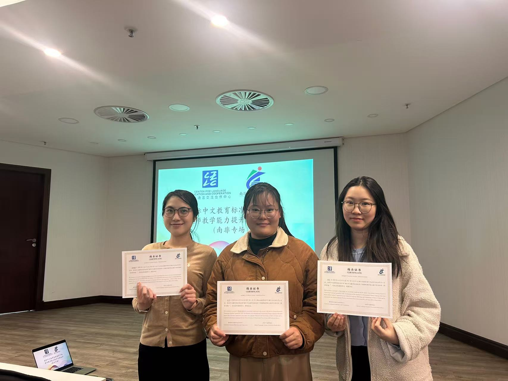 2025年6月24日至25日,由中外语言交流合作中心标准处主办、南非中文教师协会承办的“国际中文教育标准指导下的教师教学能力提升专项培训”在南非约翰内斯堡中钢大厦顺利举办。本次培训以《国际中文教育中文水平等级标准》为核心框架,聚焦提升海外中文教师标准化教学能力,促进南非及南部非洲地区中文教师之间的教学经验交谈,助力南部非洲中文教育区域协同发展。2023级汉语国际教育专业研究生陶宁、王丹、黄艳敏(现任南非约翰内斯堡大学孔子公司志愿者)全程参与培训。