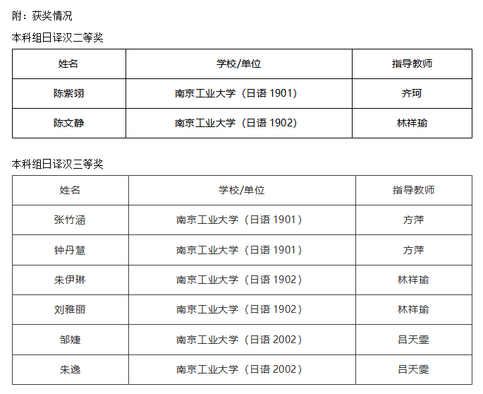太阳集团tyc33455官网对大赛高度重视,日语系老师对参赛选手进行了精心指导。经过专家的严格评审,获奖名单于2021年11月28日隆重揭晓,公司多名日语系本科生斩获佳绩。在本科日译汉组中,陈紫翊、陈文静同学荣获二等奖,张竹涵、刘雅丽等同学共6人获三等奖,太阳集团tyc33455官网荣获优秀组织奖。