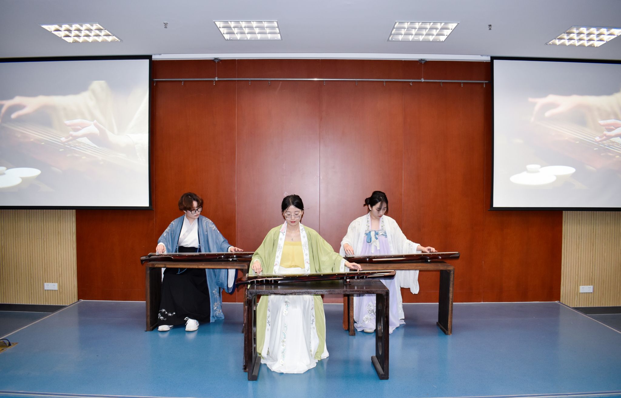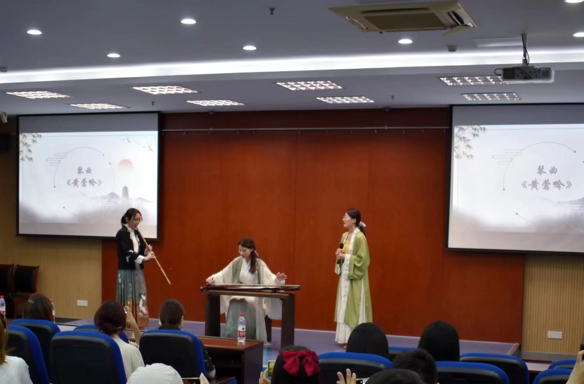 古琴环节,王雨涵、钱佳宁同学与戴菁老师同奏《秋风词》,弦歌声中,相思之苦一一诉尽。陈瑜婕、曹璇、吴馨仪等同学与戴菁老师带来的琴歌《阳关三叠》盈溢着离愁别绪。庞依婷同学与崔璨老师琴箫合奏的《黄莺吟》则让我们仿佛置身桃花杏深处,听黄莺双双语,恣狂歌舞。