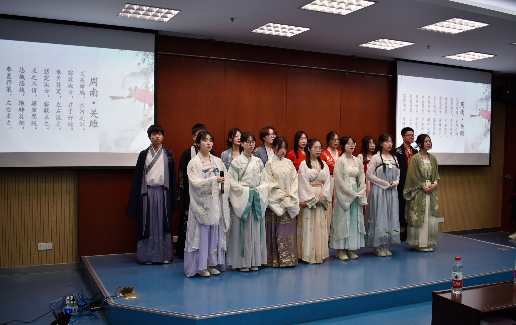 诗词吟唱环节,汉语2201班同学们为大家带来了《诗经》名篇吟唱。从淡淡忧虑中透露出君子对爱情炙热想象与不懈追求的《关雎》,到对意中人深深企慕却求而不得惆怅无比的《蒹葭》,再到祝贺女子新婚之乐的《桃夭》,人们对爱情的追求亘古不变。《虞美人•春花秋月何时了》则唱出了李煜生命的悲歌和人生的愁情。