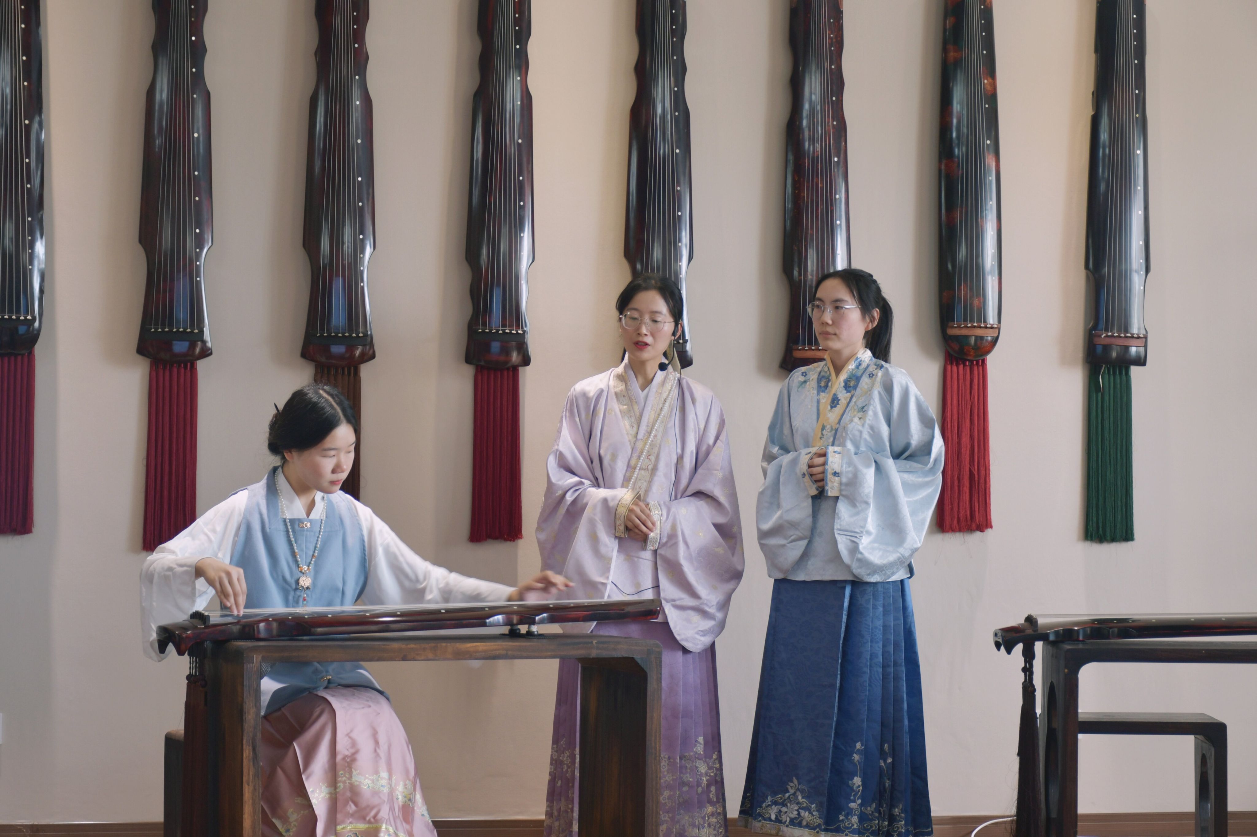 雅集以戴菁老师吟诵《诗经·小雅·鹿鸣》开场,“我有嘉宾,鼓瑟鼓琴”,婉转吟诵传递出对到场的同学的欢迎与祝福。《诗经·陈风·月出》的吟唱柔婉缠绵,同学们沉醉其中,齐唱乐曲,余味无穷;师生共同表演琴歌《阳关三叠》《黄莺吟》,诗乐相和,感受古琴韵味;2024级国际中文专业硕士全体同学表演《渔歌子》,曲调欢快活泼,向大家展现了昆唱的魅力;崔璨老师和戴菁老师琴箫合奏《暗香》,带大家一同感受姜夔词清雅幽冷的意境,同时在戴菁老师钢琴伴奏下,同学们伴乐而吟,以共同吟唱《暗香》来结束活动。师生一起着汉服、抚琴、吟诵、品茗,体验传统琴歌艺术,亲自体验茶艺,细品冬茶,了解古琴厚重的文化渊源,感受词曲意境。