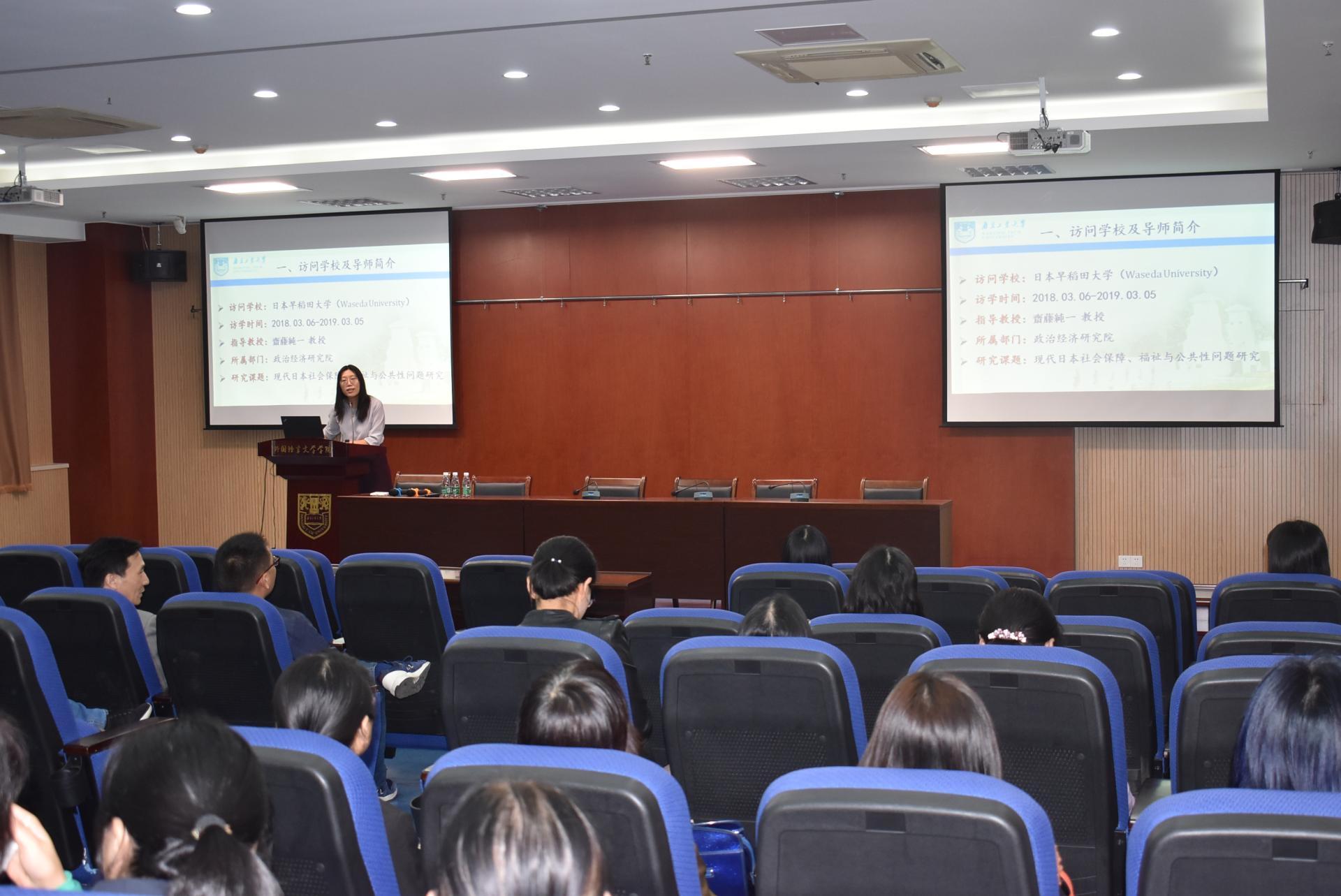 报告会上,三位老师就各自留学期间的学习情况、收获与体会同大家进行了交流。丁瑞媛老师于2018年3月至2019年3月在日本早稻田大学访学,师从斋藤纯一教授进行日本社会保障、福祉与公共性相关研究。围绕市民社会理论,丁老师详细梳理了其历史系谱,介绍了日本社会的社会保障体系,并汇报了自己的阶段性研究成果与后续研究计划;方萍老师2018年9月至2019年9月在日本东京大学访学,师从松下达彦教授和宇佐美洋教授进行日语教育的质性研究。报告中,方老师对比了质性与量性研究,通过详实的实际案例向大家介绍了TEM分析手法与PAC分析手法;黄淑琴老师2018年9月至2019年8月在英国兰卡斯特大学访学,师从Dr.Diane Potts进行二语习得与思辨型语言教学研究。通过对思辨能力的定义、类型、培养方法的分析,黄老师总结出了大学外语教学的几条重要原则。