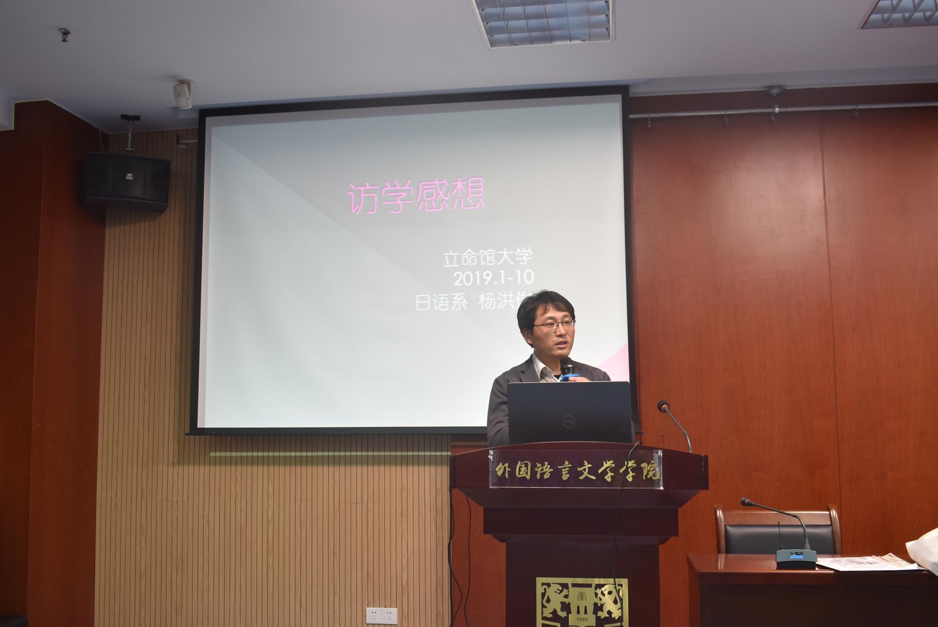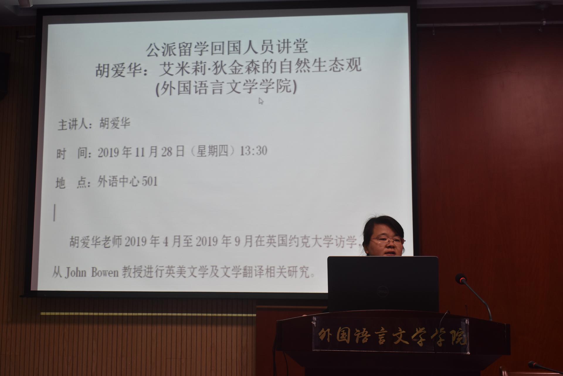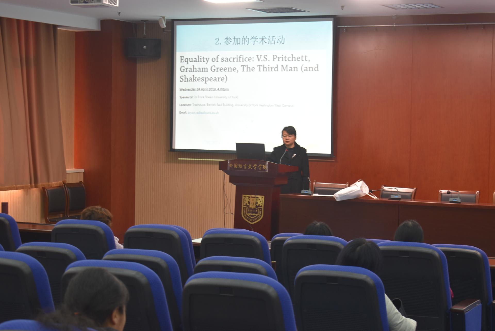 报告会上,二位老师就各自留学期间的学习情况、收获与体会同大家进行了交流。杨洪俊老师2019年1月至2019年10月在日本立命馆大学访学,师从桂岛宣弘教授进行日本近现代文学相关研究。报告会上,杨老师向大家分享了访学期间的学术研究成果,围绕《便利店人》文本,从生态女性主义视角对其进行了释读;胡爱华老师2019年4月至2019年9月在英国约克大学访学,师从John Bowen教授进行英美文学及文学翻译相关研究。报告中,胡老师向大家分享了在英国访学期间的学术活动经历,全面分析了艾米莉·狄金森的自然生态观及其成因。