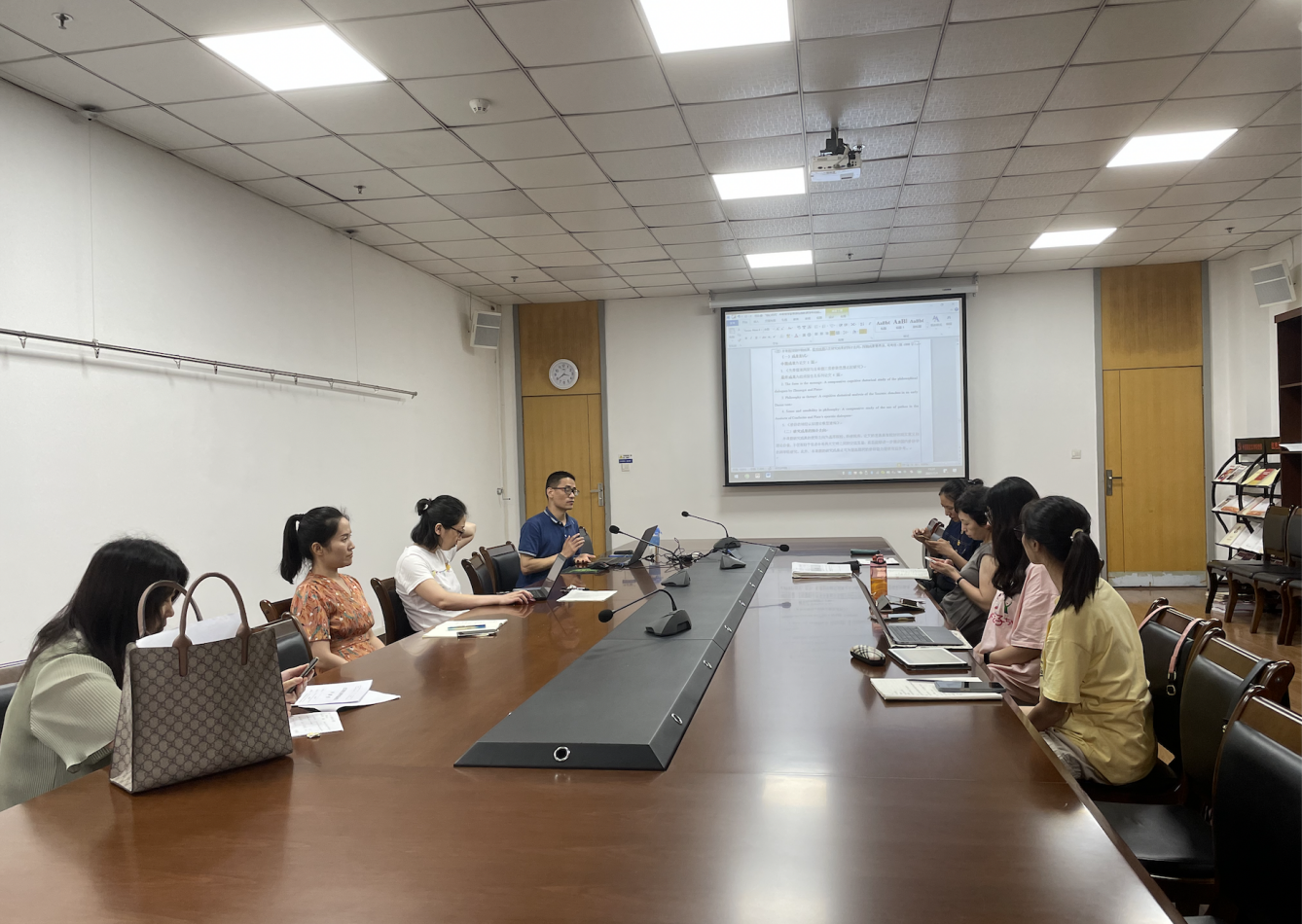 首先,项老师带领团队成员学习了认知语言学中的虚拟交际理论。结合具体案例,项老师从缘起、定义、核心思想、识别特征等几个方面对该理论的主要内容进行了讲解。在对相关文献进行细致梳理的基础上,项老师对虚拟交际理论的最新研究进展进行了回顾,提出可以从跨语言、跨文化和多模态几个维度开展虚拟交际研究的建议。