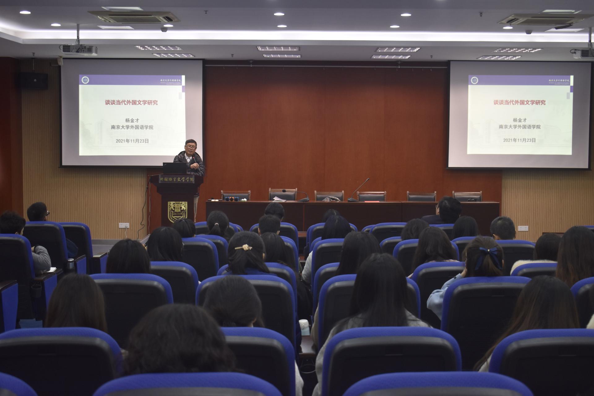 11月23日下午,国家级人才、南京大学外国语公司杨金才教授应邀来公司讲学,在外语中心员工实践能力演示厅作了题名“当代外国文学研究之我见”的学术讲座。讲座由太阳集团tyc33455官网经理陈世华教授主持,外语公司全体教师和研究生参加了本次学术活动。