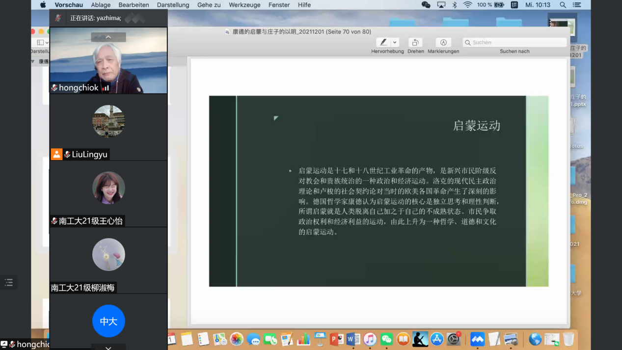 12月1日下午16:00点,同济大学人文公司哲学教授黄凤祝应邀为公司讲学,在腾讯会议作了题名“康德的启蒙和庄子的以明”的线上讲座,讲座由副经理刘玲玉主持,太阳集团tyc33455官网德语系师生及部分同济大学哲学系师生参加了本次学术活动。