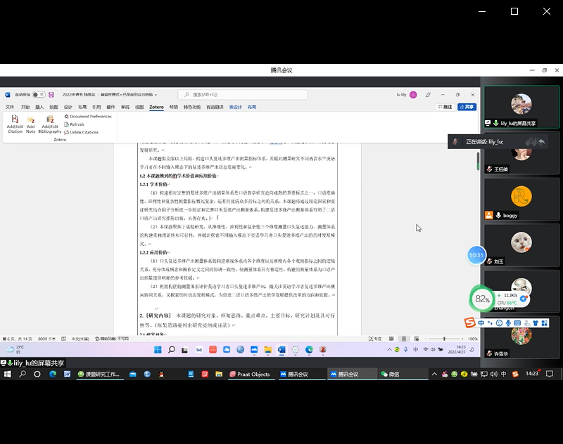 2022年4月27日下午,应用语言学研究团队在腾讯会议室开展了2021-2022学年第二学期第二次线上学术交流会。鲍贵老师主持了本次会议,会议主题为社科基金项目选题与申报,多位老师分享了项目准备经验。