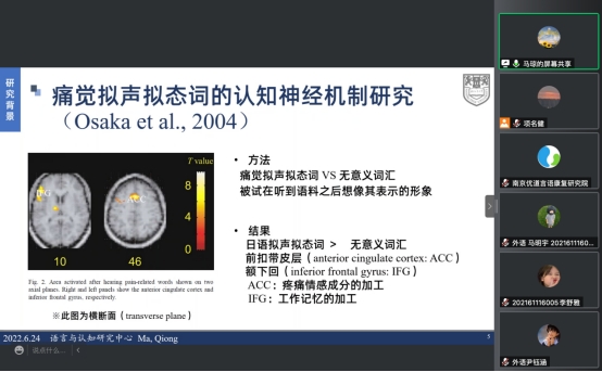 接着,马琼博士做了题为《日语痛觉拟声拟态词的认知神经机制研究》的报告。该研究采用神经影像学和行为实验相结合的方法,对痛觉拟声拟态词与普通副词在认知方面的差异进行了深入的讨论,揭示了语言层面疼痛共情的认知神经机制,可为失语症患者的语言康复干预提供有益参考。