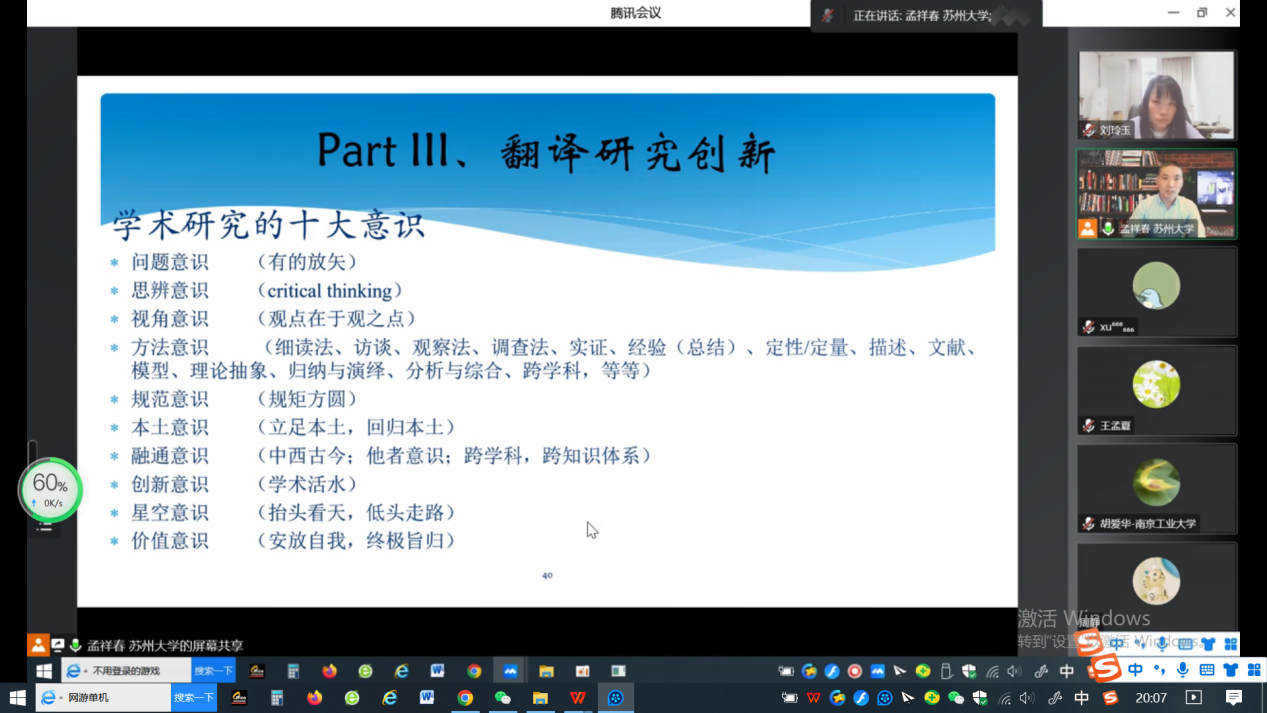 孟教授从国家社科基金中华学术外译项目的申报概况(包括:流程与材料、样章翻译注意事项、《申报书》填写要点以及其他注意事项)、文化翻译策略、翻译研究创新三个方面分享了申报国家社科基金中华学术外译项目的经验与教训,提炼了文化翻译的重要策略并总结了翻译研究创新的意识和内容。