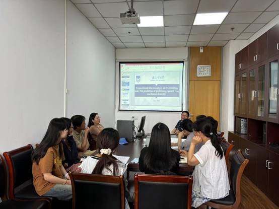 2025年6月25日下午14:00-15:30,应用语言学研究团队在外语中心723室召开了2024-2025学年第二学期第四次学术交流会。鲍贵老师主持了本次会议,团队核心成员陆俊花老师就“Propositional idea density in an EFL retelling task: The prediction of proficiency, speech rate, and lexical diversity”开展学术交流。另外,团队成员陆安勤同学报告了关于学习者口语产出中短语长度使用的研究,着重和大家分享了与导师的交流心得。