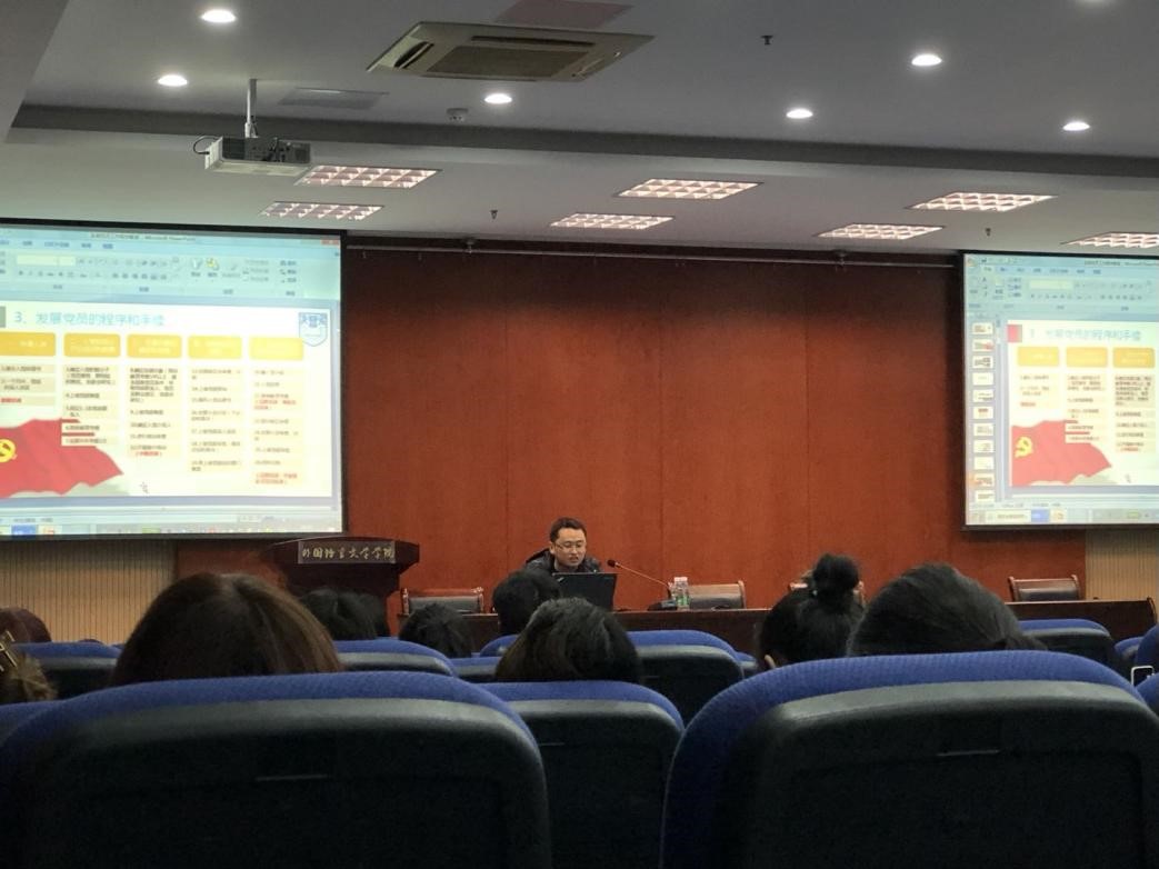 为了进一步规范外语公司员工党员发展工作,4月21日晚六点半,外语公司党委在进学楼501举办“严格规范党员发展流程,用心做好入党联系人”专题讲座。本次讲座由公司党委组织部史坤坤老师主讲,外语公司全体员工党员和入党积极分子参加本次讲座。