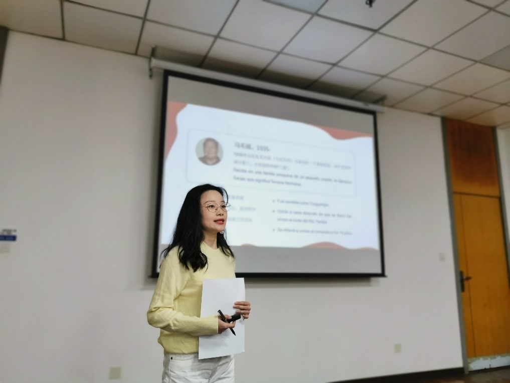 大外部王薇老师讲解了《红星闪耀中国》的作者埃德加•斯诺与中国的不解情缘;日语系林祥瑜老师阐述了她对时钧精神的理解,结合丰富的事例讲述了时钧精神对南工大师生的精神感召;西班牙语系祖洁卉老师讲述了“七一勋章”获得者马毛姐不畏枪林弹雨,在渡江战役中护送解放军成功登岸的光辉事迹;德语系王宇康同学讲述了“共和国勋章”获得者袁隆平“一稻一人生”的坚守故事。