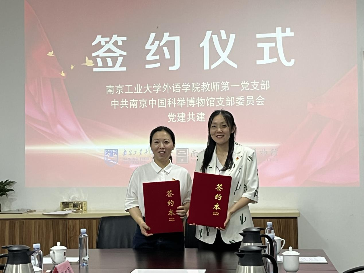 南京中国科举博物馆副馆长、党支部书记薛银对公司一行表示热烈欢迎,介绍了南京中国科举博物馆概况、党支部建设现状和特色亮点,表达了强化校馆双方交流合作的愿望。公司党委书记张翔介绍了公司在人才培养、团队建设和党建活动等方面取得的成果,表示将积极搭建校馆互动交流、联学提升、志愿服务和文化传播的平台,推动公司与博物馆资源共享、优势互补,通过党支部共建凝聚协同发展合力。外语公司教师第一党支部书记林祥瑜和南京中国科举博物馆党支部书记薛银共同签订支部共建协议。
