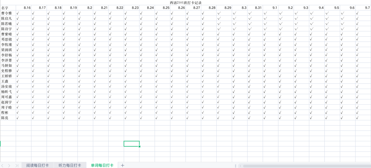 在七位新生助理班主任的组织和带领下,新生们利用假期时间进行线上每日阅读、每日听力和每日单词等多项学习打卡活动。活动期间,2021级新生积极参与,高质量学习,完成了多种多样的线上学习打卡。