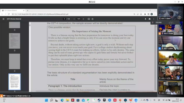 在助理班主任的组织带领下,各班通过腾讯会议以多样的学习互助形式展开,如自主预习复习、英语六级考试集体备考以及语言能力提升等。作为参与者,2021级的同学们纷纷表示受益匪浅。“进入云自习室后,看到大家认真学习的模样,我不由得也更加专注了起来。”西语2101班的曹令雅同学说道。作为组织者和监督者,助理班主任也真正融入了班级同学的学习生活。“我平时有点拖延,加入云自习室后,晚上的学习时光得到了高效的利用,让我能够做到‘今日事今日毕’,感觉和班级同学的距离也更加近了。”腾子晗如是说。