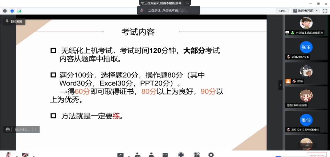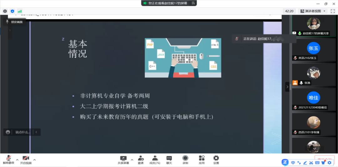接着,吴倩同学细致地讲解了全国计算机应试的注意点,对前面的分享进行了有益补充,分享了无纸化理论题,并强调了备考时练习的重要性。