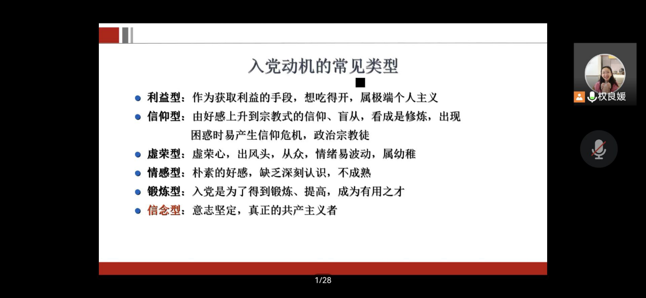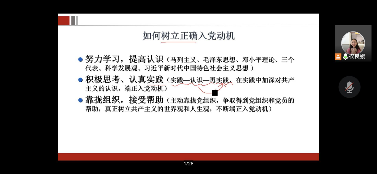 权良媛老师从正确认识中国共产党、树立正确的入党动机、端正入党态度三个方面入手,结合革命先烈、优秀共产党员的先进事迹,引导同学们传承红色基因、坚定理想信念。权老师还就入党条件、入党流程、发展程序、党员先锋模范作用发挥等方面进行详细的介绍,鼓励同学们提高思想觉悟、增强服务意识,以实际行动争取早日加入中国共产党。