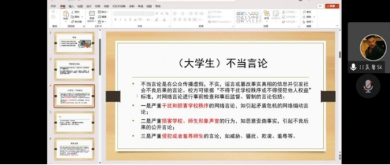 汉语2201团支部由班级反诈专员吴馨怡同学负责讲述,从“网络言论自由与相关法规”、“老员工不当言论案例及后果”和“正确使用网络发声的倡议”三个板块详细展开。日语2201团支部以《文明上网自律公约》 为切入点,列举了个人信息泄露、网络暴力等有悖道德、有损公共利益的事件,借此向大家介绍文明上网的重要性,自觉成为文明网民。西语2201团支部向大家介绍了网络安全的内涵以及重要意义,用具体事例带领同学们认识“网络不是法外之地”这一重要内涵。