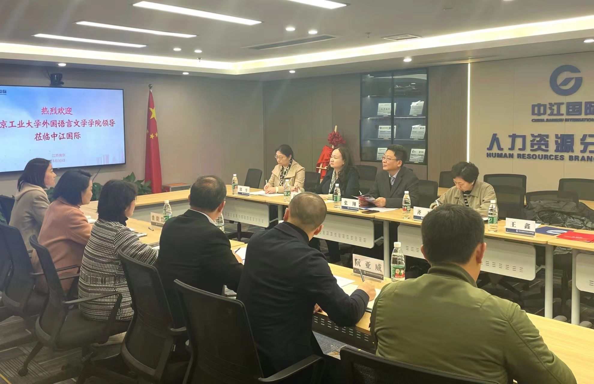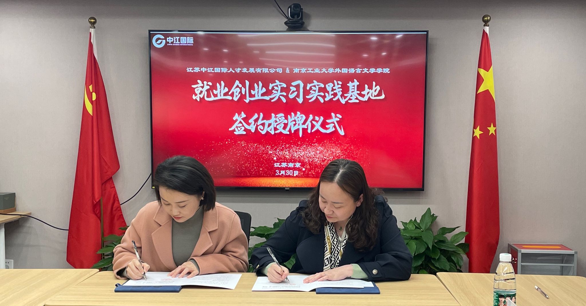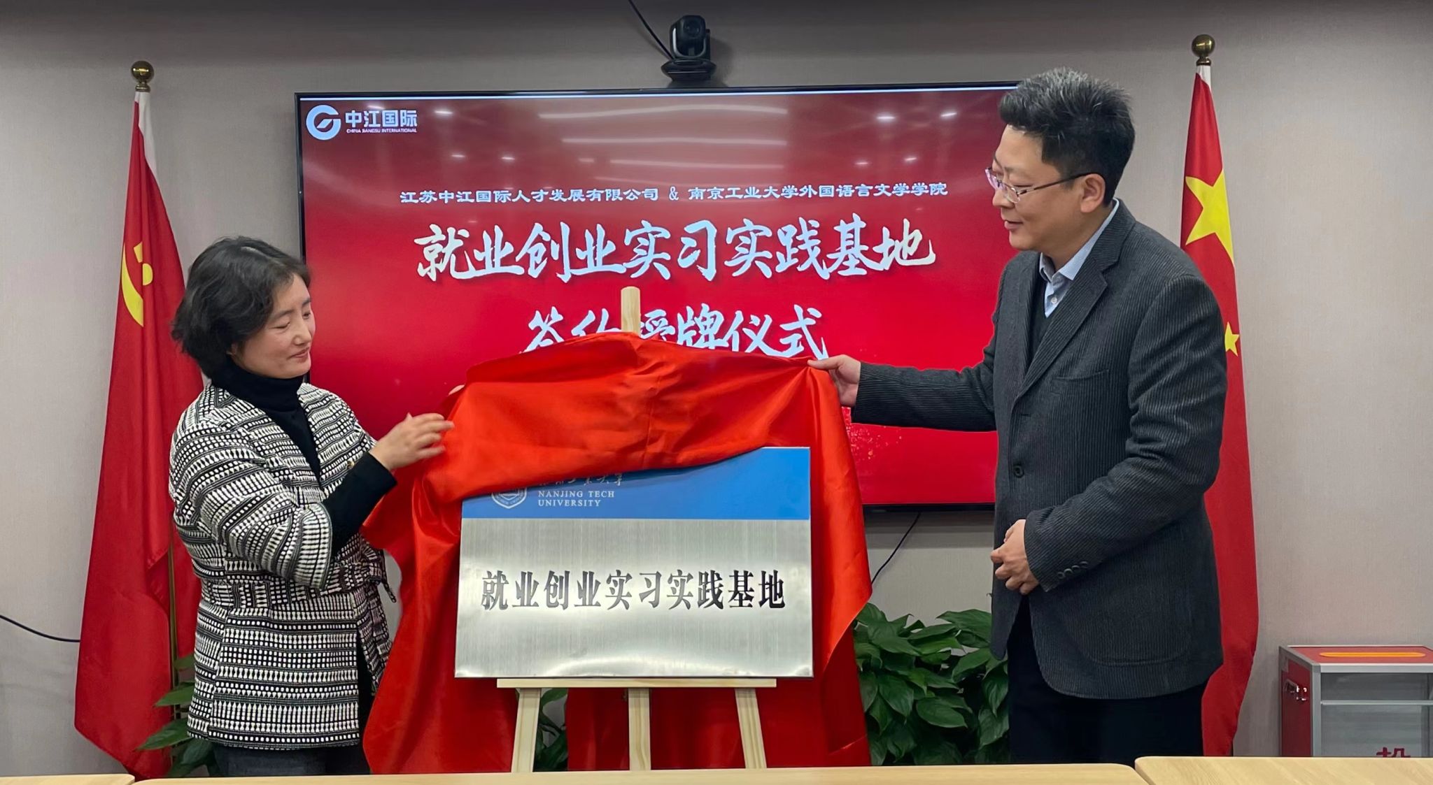 刘怡、费阳阳分别从人才强企工程、校企文化融合、职业教育培训等方面详细介绍了公司相关情况,并表示希望能与公司加大合作广度、深化合作维度。张翔向中江国际多年来对公司毕业生就业工作的关心和支持表示感谢,并详细介绍了太阳集团tyc33455官网专业建设、人才培养及国际交流等方面的情况。高洁就公司毕业生的相关情况和校企合作等方面做了介绍。双方交流热烈,共同表示愿意在人才培养、就业实习、员工引领等方面协同发力,助力语言类人才的培养。最后,双方签署了就业创业实习实践基地建设协议书,并为“太阳集团tyc33455官网就业创业实习实践基地”揭牌。