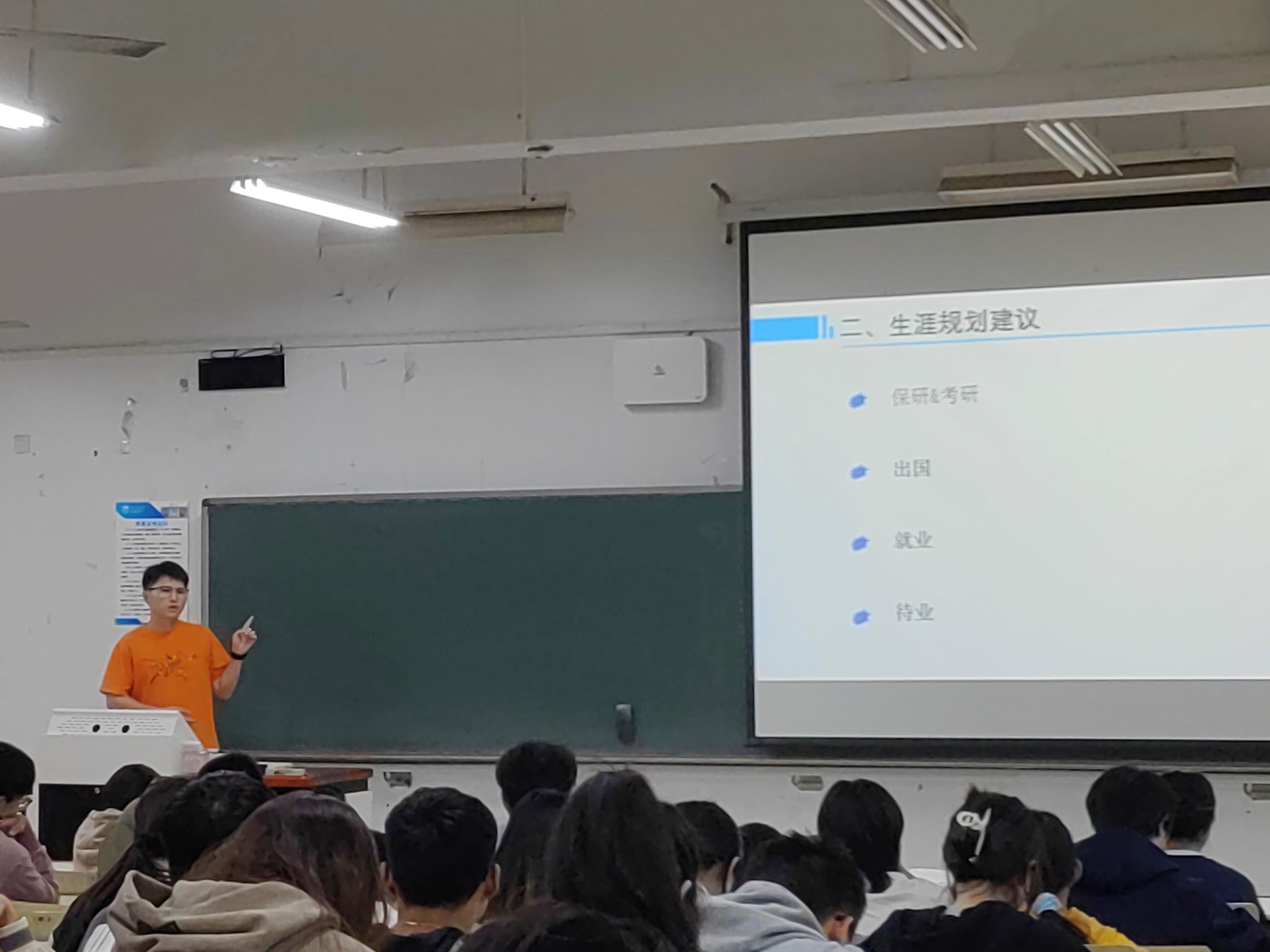 随后,王鑫老师围绕保研、考研、出国留学和就业四个方面对同学们进行职业生涯规划指导,他殷切地希望同学们不论是在“大城市”还是在“大平台”都可以将“选择”与“努力”结合,将“梦想”与“方法”结合,兼顾兴趣和专业慎重思考,端正态度付诸努力而未雨绸缪。他强调,职业生涯规划固然重要,但眼下的首要任务仍然是高质量完成学业,夯实专业基础,提高政治素养。
