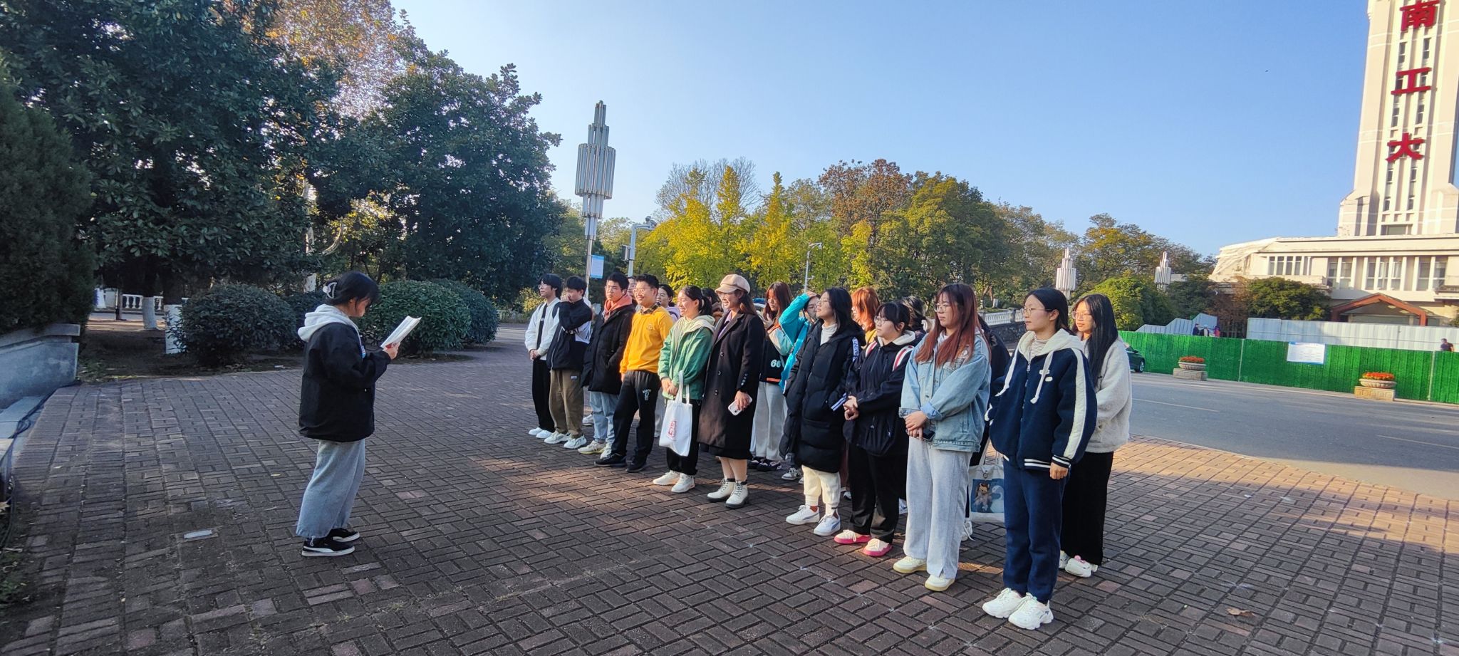 在班委的带领下,同学们在南工水塔下集合。此次活动分为三部分,首先进行的是“热词猜猜看”趣味活动,接着是“党政知识抢答”,同学们在欢声笑语中,不仅收获了新的知识,还感受了时代前进的步伐。
