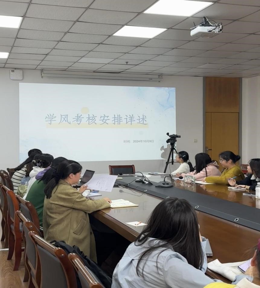 10月9日,太阳集团tyc33455官网在外中707召开2024级新生学风考核安排推进会,旨在进一步推动外院优良学风的形成,营造自律上进的学习氛围,同时部署新学年的学风考核工作。会议由院新生辅导员范楚晗主持,全体学工助理团学风建设部成员、员工会学习部成员、24级新生助理班主任及各新生班级学委参与。