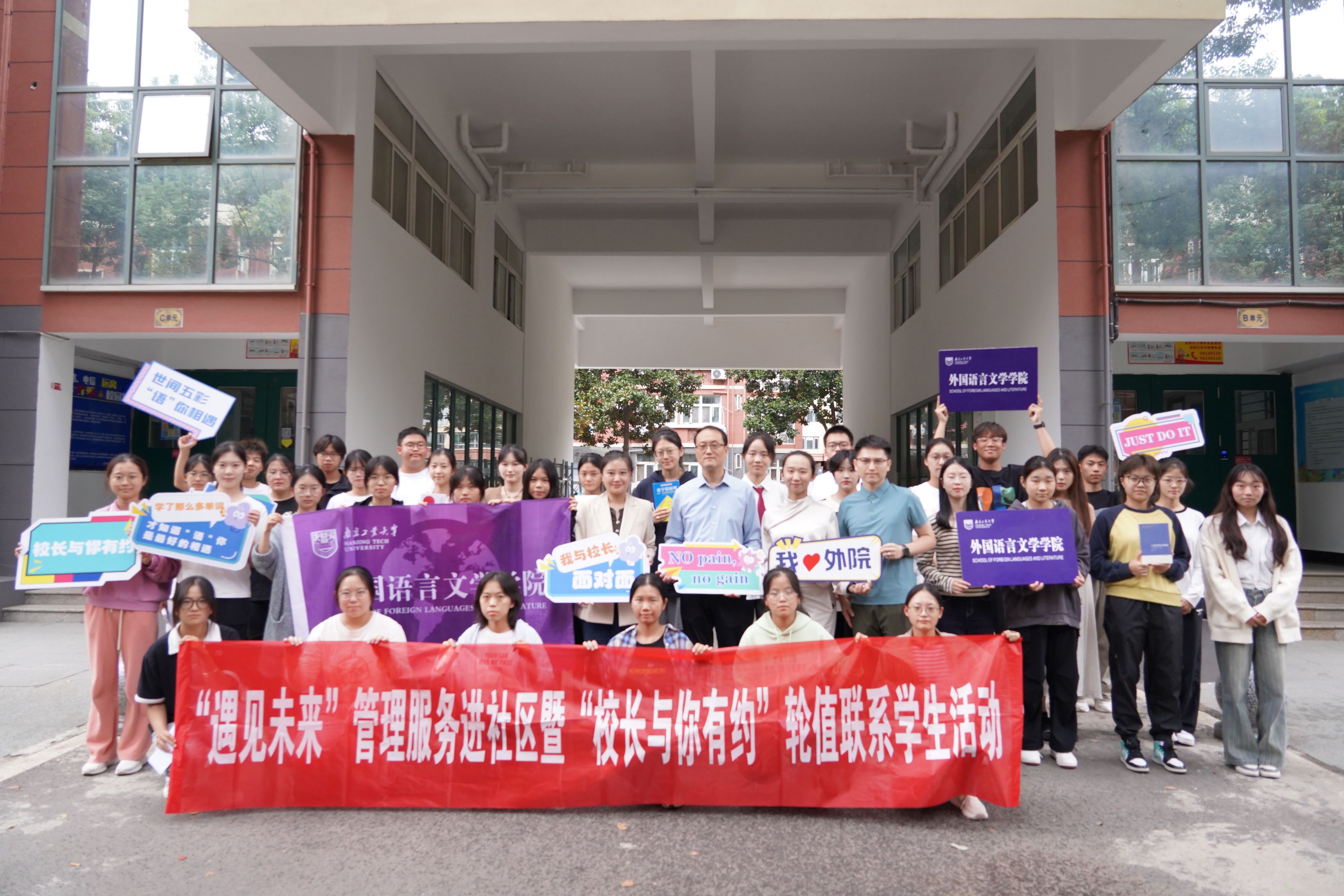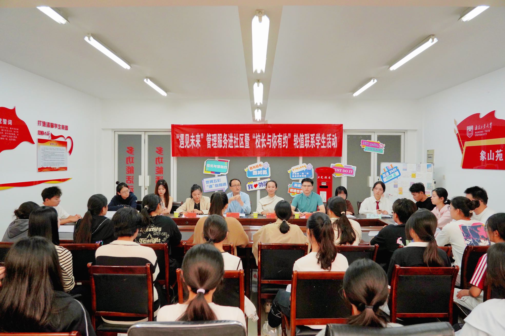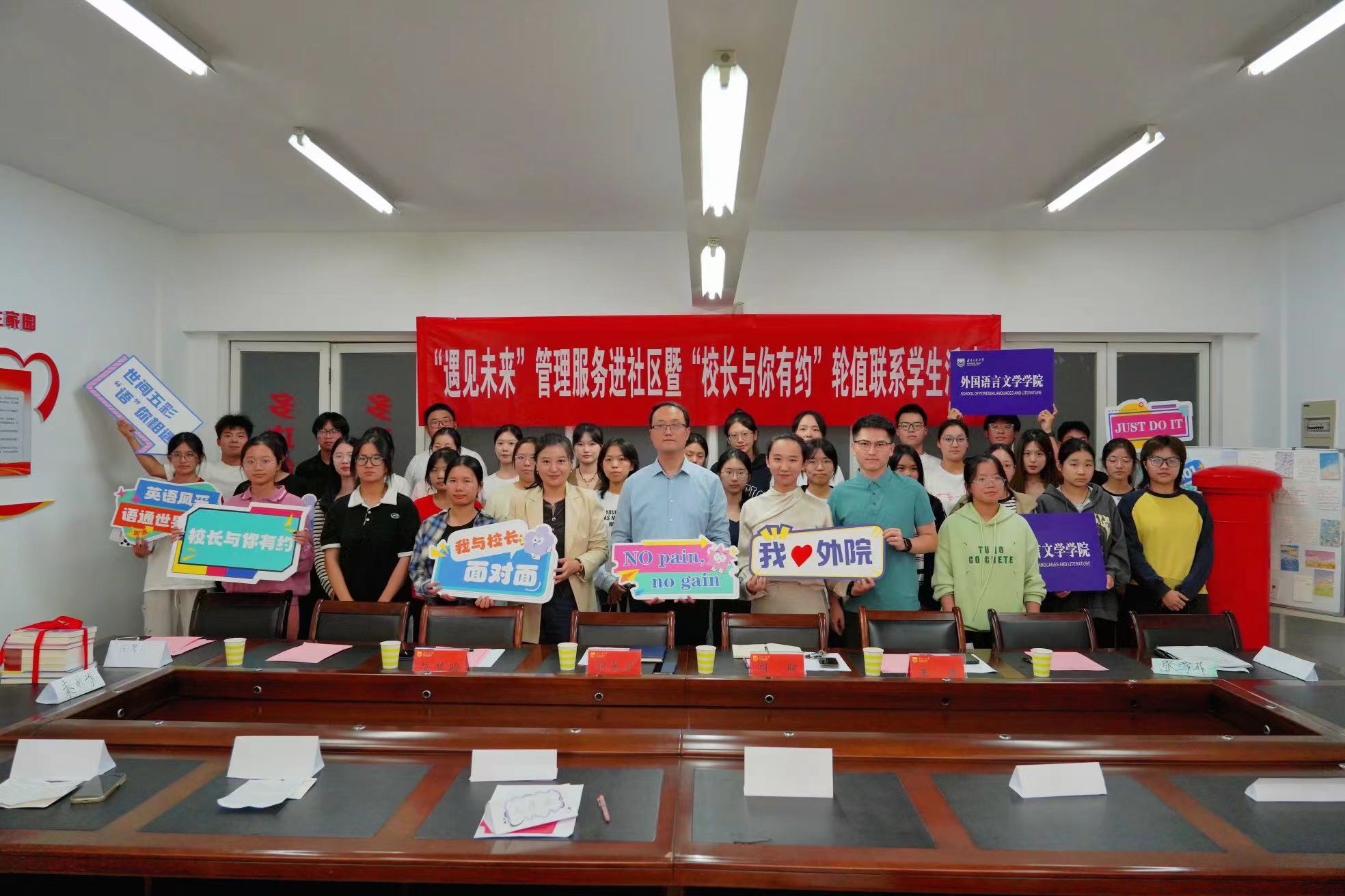 10月16日,管理服务进社区之“遇见未来”暨“董事长与你有约”轮值联系员工活动在象山“一站式”社区举行。副董事长刘大卫、外语公司党委副书记闻敬、学办全体老师、员工会(研究生会)代表、员工骨干代表及英语2401班同学参加活动。