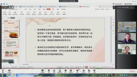 会议伊始,刘玲玉副经理首先介绍了与会的各位嘉宾,代表公司表达了对国际合作处和约堡孔院给予长期支持的感谢。其次,刘经理回顾了汉语国际教育专业海外实习的历史,指出本次实习是疫情之后的首次实习,公司、国际合作处与约堡孔院为本次实习的成功启动克服了重重困难,做了大量的前期筹备工作,希望同学们能够珍惜这次宝贵的实习机会。