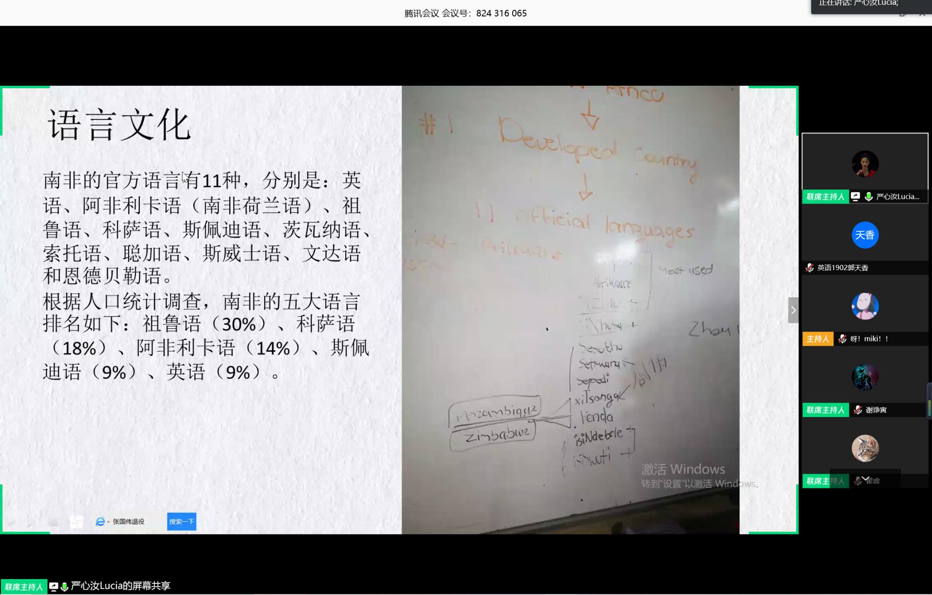 为引导员工坚持“文化自信”,做好中国文化的传播者,4月8日下午,外语公司邀请汉语国际教育1601班谢诤寅,严心汝,瞿睿,曹贝贝四位同学,通过腾讯会议平台举办了“汉语起航,对话南非”——赴南非志愿者汉语教学经验分享会。汉语国际教育专业近百名学子参与了分享会。分享会由2019级辅导员王燕凝老师主持。