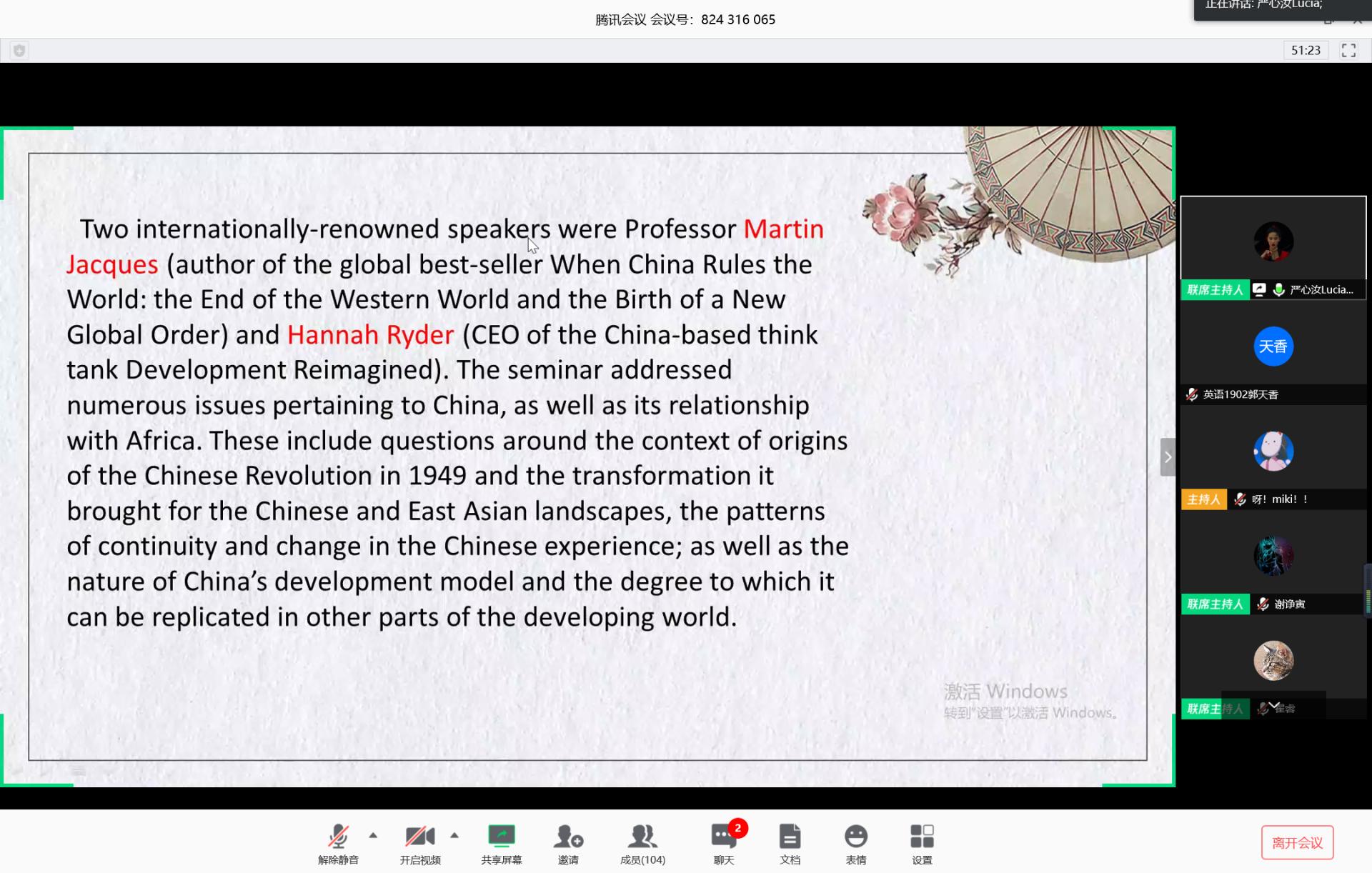 讲座开始,谢诤寅分享了自己在南非学会了与不同国籍的人沟通合作,大大提升了自己的课堂把控能力,能更深刻的认识教育,对各国之间的教育差异有了更深层次的感受;严心汝则介绍了丰富多彩的南非文化,带着大家“云品尝”了南非的美食。随后,瞿睿和曹贝贝向同学们具体介绍了南非约翰内斯堡大学孔子公司的建设历史,全面阐述了孔子公司传播汉语言、汉文化的职能,让同学们对孔子公司有了一个更清晰的认识。最后,四位同学鼓励大家积极申报汉语教师志愿者,希望同学们作为文化传播的使者,应该要做到谨言慎行,严于律己,宽于待人,将中国优秀的传统文化带到全世界;其次希望同学们能够积极主动学习,提高自身的文化修养,真正做到教学相长,提升自身的人格品质。