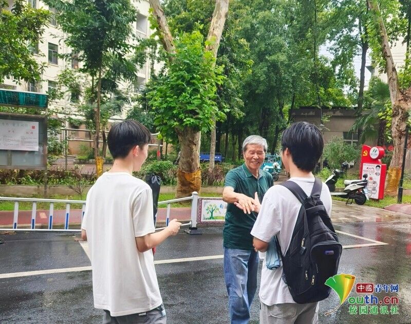 图为雨后的桥工新村丁师傅向实践团队成员们告别。中国青年网通讯员 徐凝嘉 摄