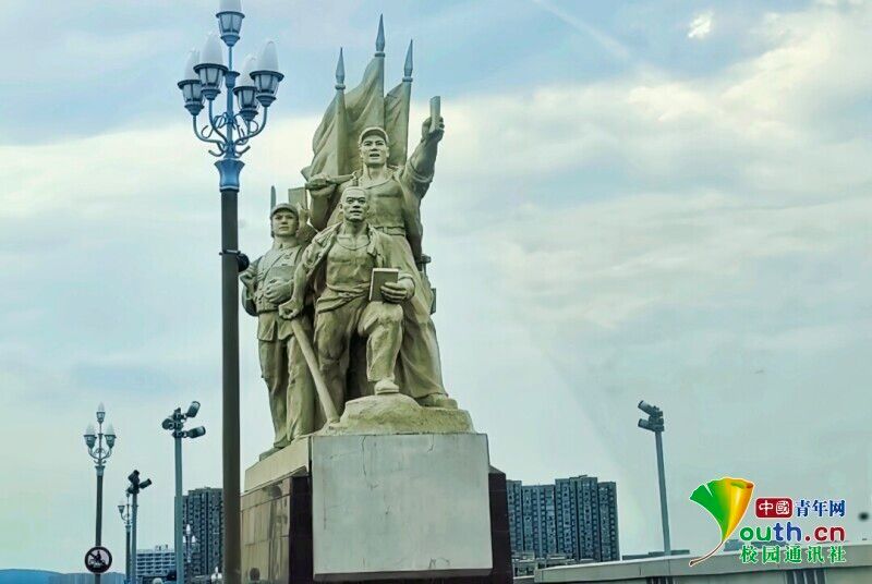 图为丁师傅受访中提及的“桥头堡上亲自吊上去的工农兵石像”。中国青年网通讯员 徐凝嘉 摄