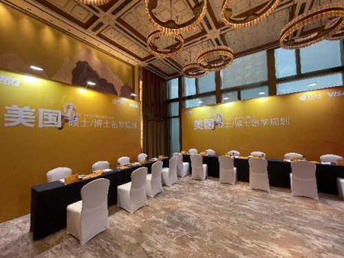 图为同学们协助工作人员布置好的国际教育展咨询会场
