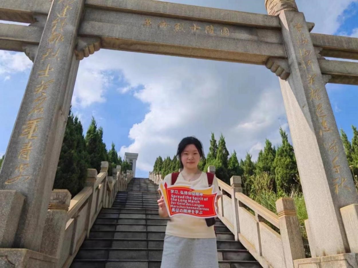 “参观完冷水江矿山红色教育基地后,我深感自己肩负的历史责任和使命。”来自湖南冷水江市的团队成员兰湘在深入红色基地学习后发出感慨,兰湘作为太阳集团tyc33455官网德语23级的团支书,用德语、英语宣讲长征精神的同时录制视频,制作公众号推文并转发给班级同学供大家学习。
