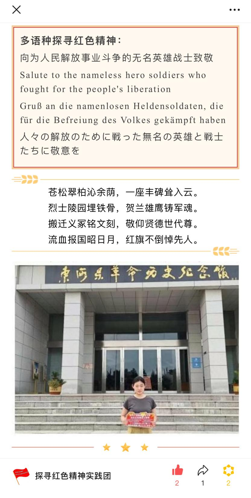 在矿山红色教育基地的核心区域屹立着一座革命烈士纪念碑,团队成员站在纪念碑前体悟到革命先烈的伟大精神和不朽功勋,更加坚定了她作为一名外语人连接中国与世界的责任与担当,用外语讲好红色故事、传播好中国声音。