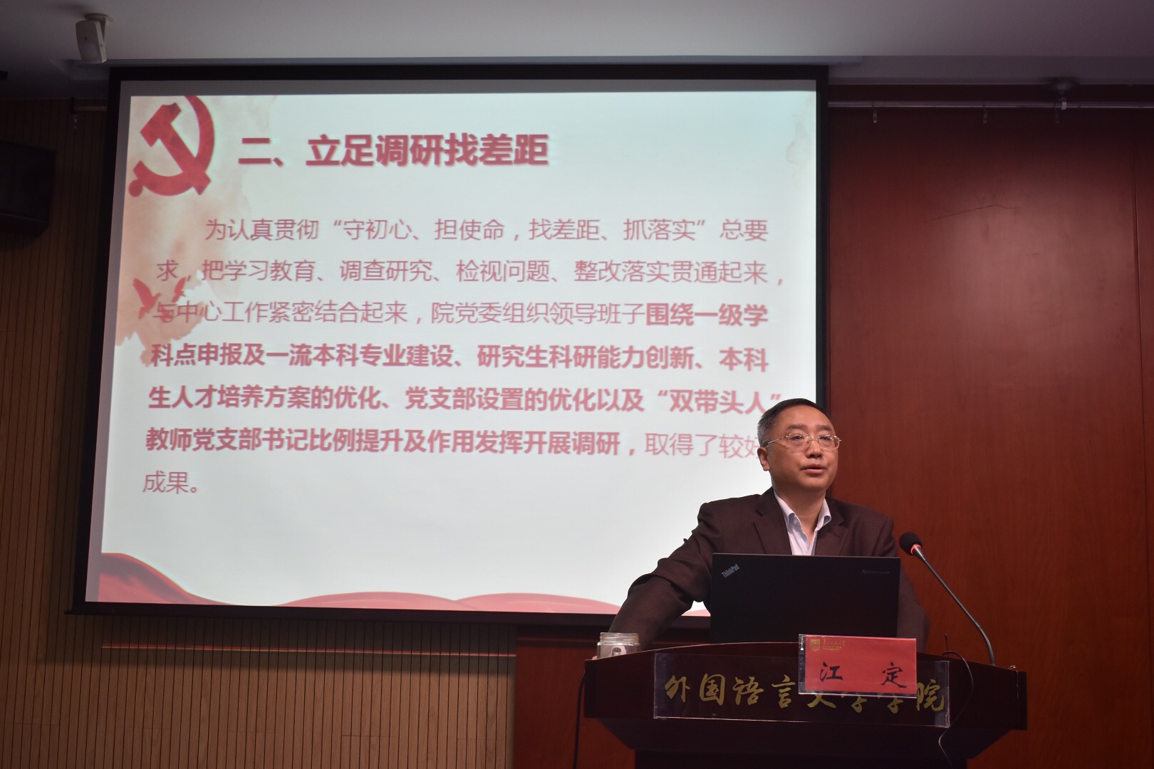 江定同志首先就主题教育开展以来有关工作的进展向各位党员做了简要回顾。随后,他围绕“为什么要强调初心和使命”、“如何守初心、担使命”讲述了主题教育期间的学习体会。江定同志表示,强调初心和使命是实现民族复兴的需要、持续固本培元的需要和抵御风险的需要,要有自我革命的决心、破解难题的信心和知行合一的恒心。作为公司党的建设和思想政治工作的第一责任人,决不能有停一停、歇一歇的想法,要坚持问题导向,真刀真枪解决问题。在分析当前公司事业发展的困难和挑战的基础上,江定同志就公司党委领导班子的调研开展情况和问题落实情况向全体党员做了汇报,号召全体党员聚焦建设“国内知名、省内一流”外语公司的目标,在习近平新时代中国特色社会主义思想引领下,不忘初心、牢记使命,以实际行动践行好“两个维护”,以崭新的面貌庆祝新中国成立70周年!