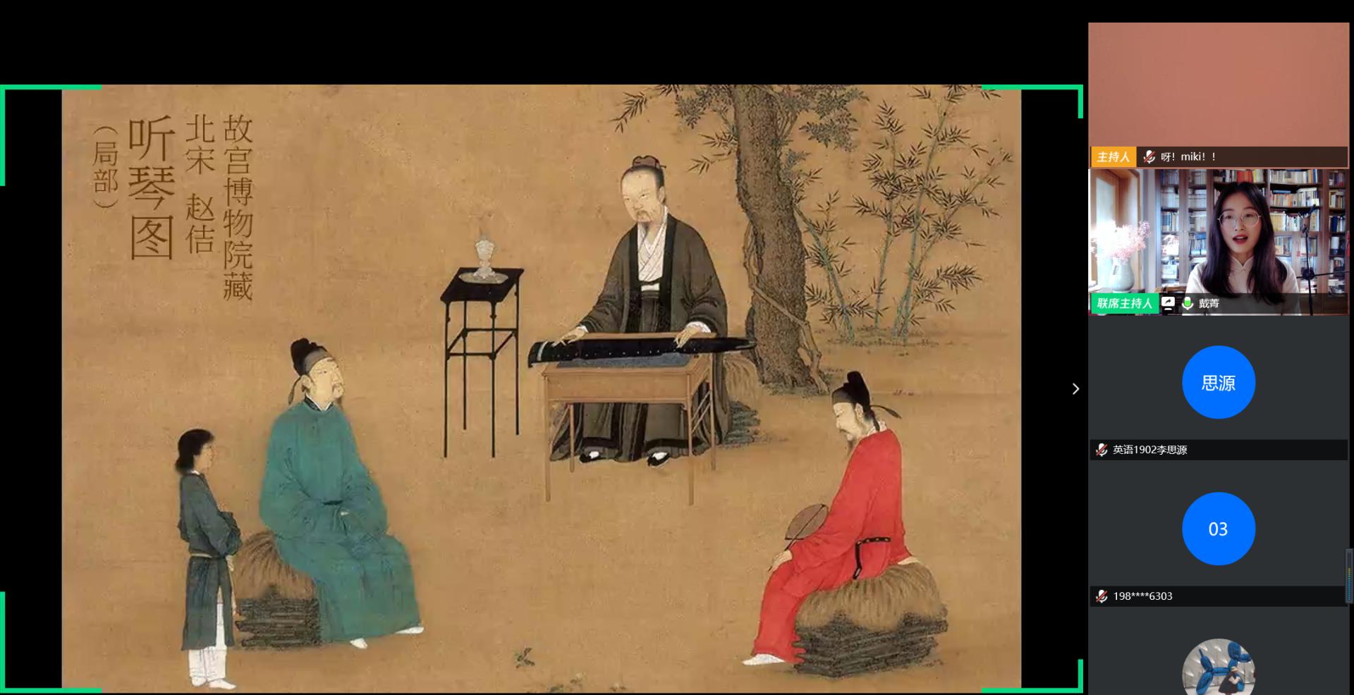 为传播中国传统文化,使同学们更好地感受中国文人情志,丰富公司员工第二课堂线上活动,429日下午,外语公司“观文讲堂”特邀汉语国际教育专业戴菁老师,通过线上平台举办了千年风雅——古琴与中国传统文化讲座。公司19级全体员工及汉语国际教育专业的同学们参与此次讲座。