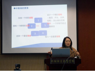 随后,杨芳老师从消息标题的结构、制作、写作技巧等方面为同学们讲解了如何撰写新闻稿,教育同学们要保持新闻敏感性。另外,杨老师还根据具体的事例指出:好的新闻应该反映时代风貌、关注员工关切,解决员工期盼,服务员工成长成才。在杨芳老师的讲解中,同学们学习了解了如何准确表达信息、如何运用适当的语句和词汇以及如何写出一篇清晰简洁的新闻稿等写作技巧。这些技巧在帮助新闻稿撰写者更好地传递信息的同时,也提高了新闻稿的可读性。