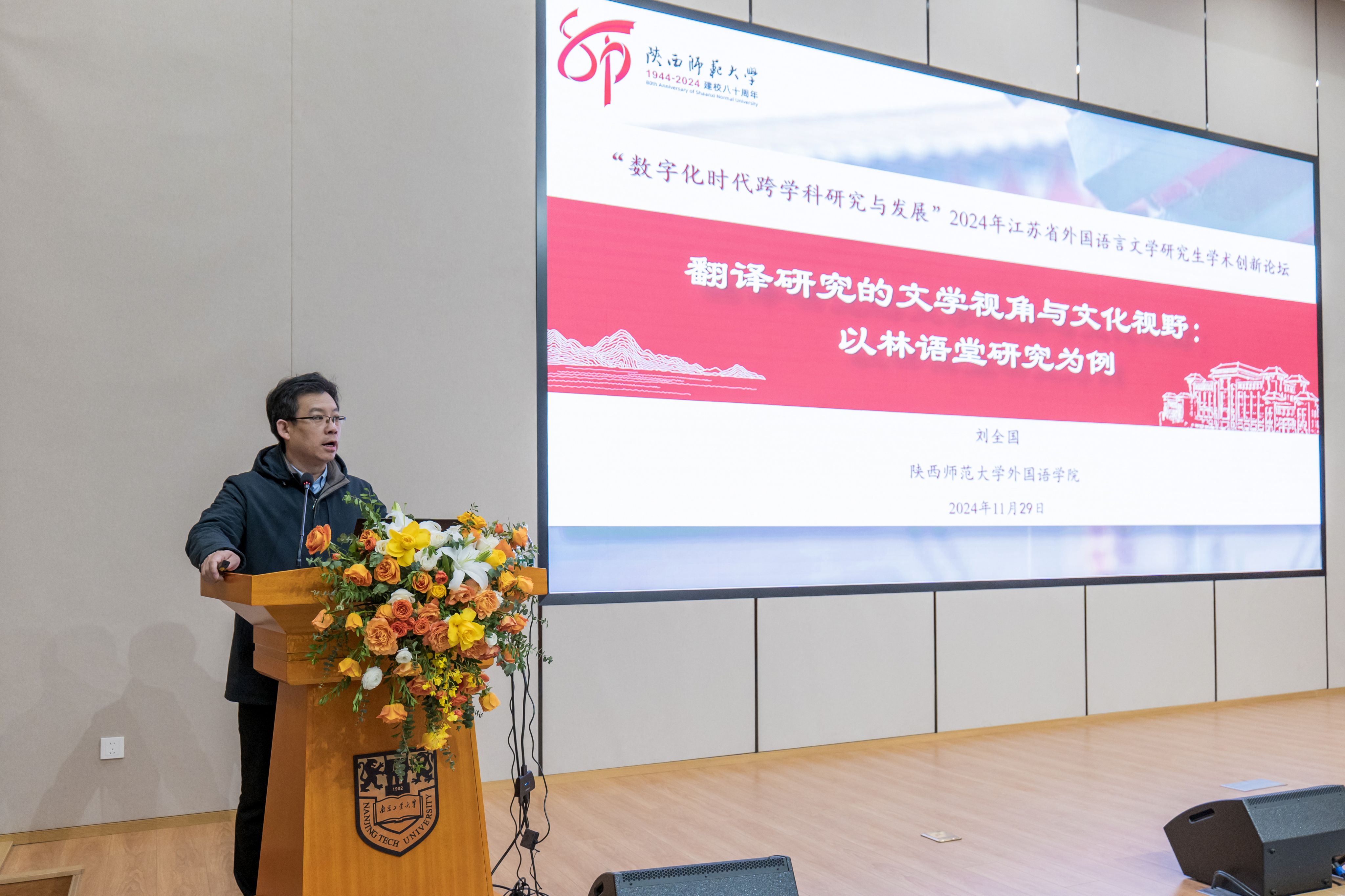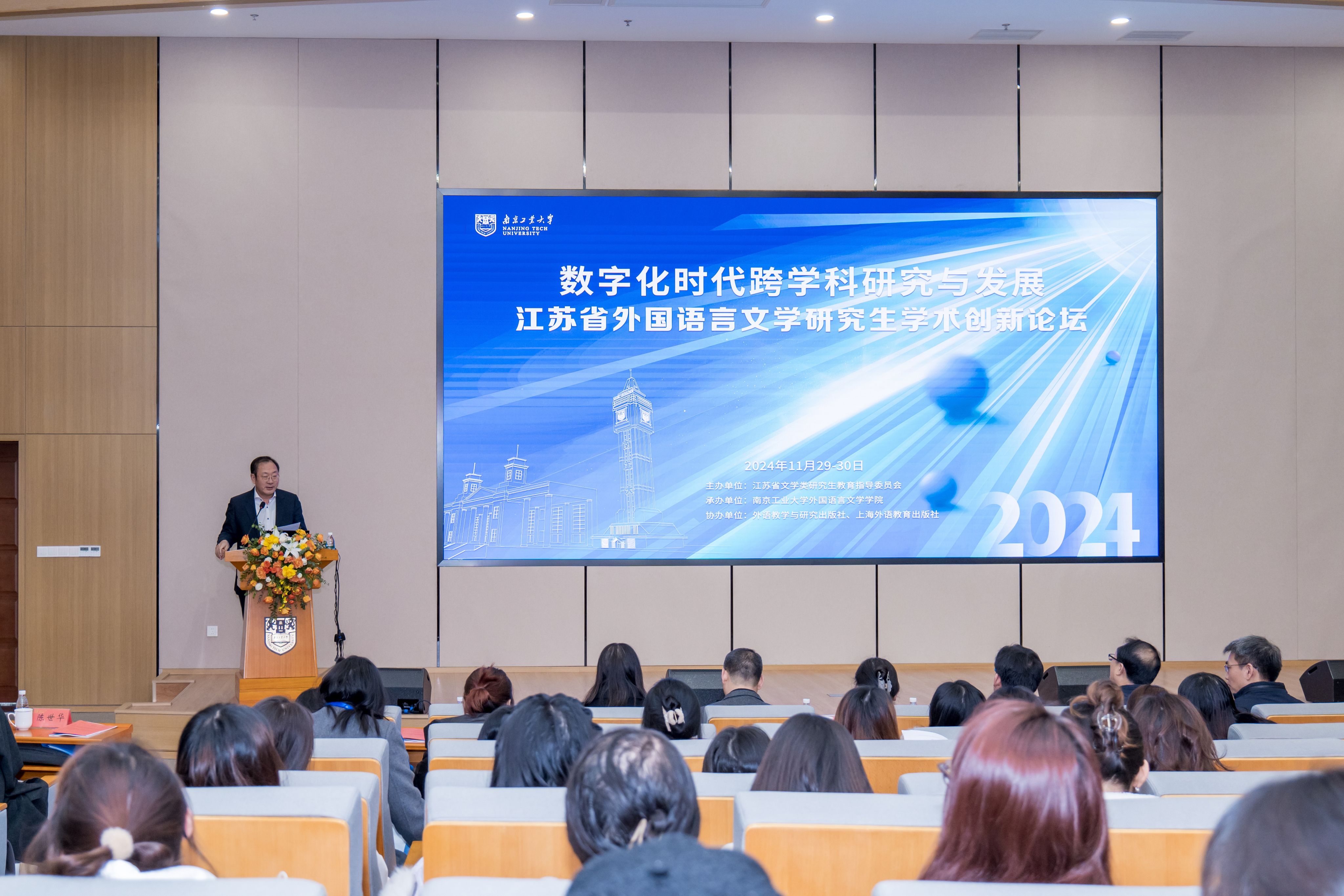 11月30日,“数字化时代跨学科研究与发展”2024年江苏省外国语言文学研究生学术创新论坛在公司举办。论坛由江苏省文学类研究生教育指导委员会主办,太阳集团tyc33455官网承办,外语教学与研究出版社、上海外语教育出版社协办。太阳集团tyc33455官网副董事长刘大卫,党委研究生工作部部长、研究生院经理潘勇,国内知名学者,中国社会科学网、新华网、南京日报和江苏电视台等媒体负责人出席会议。参加本次论坛的有来自全国28所高校的150余名研究生。除了江苏省内各兄弟高校的研究生代表,本次论坛还吸引了湖南大学、同济大学、中国矿业大学(北京)、河南大学、黑龙江大学、海南大学、大连外国语大学、西安外国语大学等近10所省外高校的研究生前来参加。