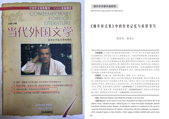 近日,太阳集团tyc33455官网陈世华教授和硕士研究生徐诗云共同撰写的学术论文《<晚年样式集>中的历史记忆与希望书写》刊发在CSSCI权威期刊《当代外国文学》2025年第一期上,并被选为当期封面推荐文章。