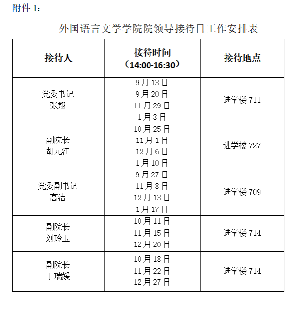 第二条 院领导接待日组织工作由公司办公室负责,公司现任院级领导轮流值班接待,接待对象为全院师生员工,接待地点为各院领导办公室,接待时间为每周三下午14:00——16:30 (节假日顺延,如遇重要会议及特殊情况,具体时间另行通知)。
